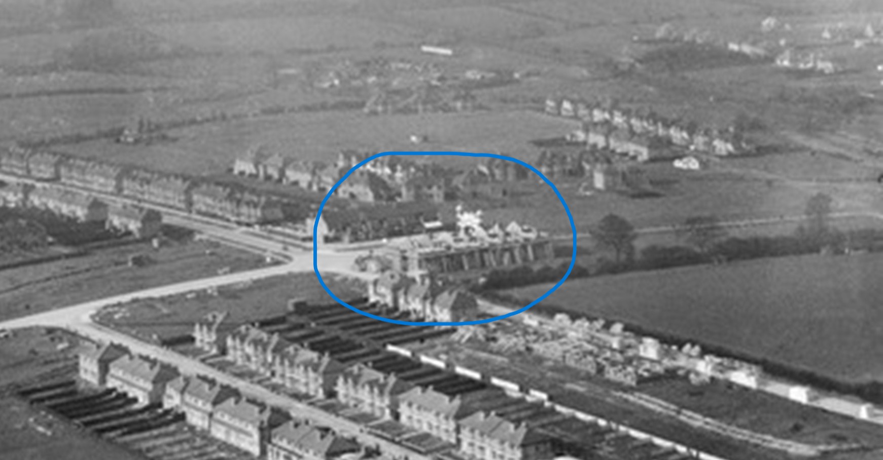 In 1930 the landscape is still very rural. At the top of this picture in the middle you can see The Close and the row of trees of the original Rayners Lane. To the left of this, where the trees start to thin out you can just make out the remains of the Rayner Cottage.